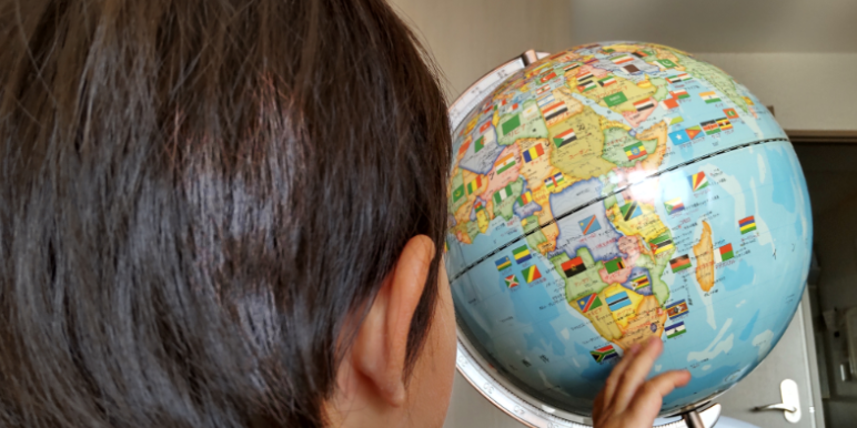 国旗に興味を持って、たくさん覚えたので、 国旗入りの地球儀を勝ってみました。 先に世界地図に慣れて、後から地球儀を見るよりも、 先に地球儀に慣れてから、平面の世界地図を見た方が良いと思います。 地球儀の方が本物の大陸の形を映し撮っているからです。